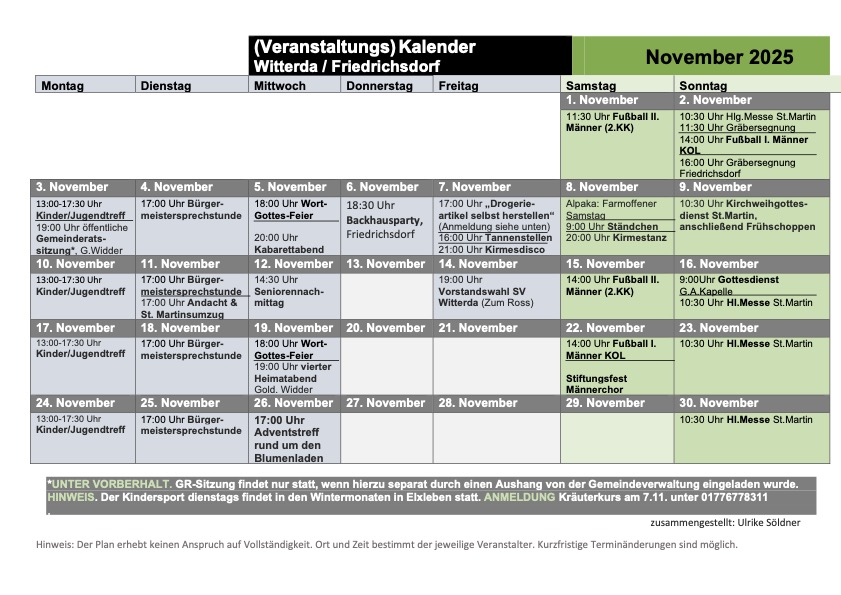 Die aktuellen Veranstaltungen im November in Witterda und Friedrichsdorf können Sie der nachstehenden Übersicht entnehmen.