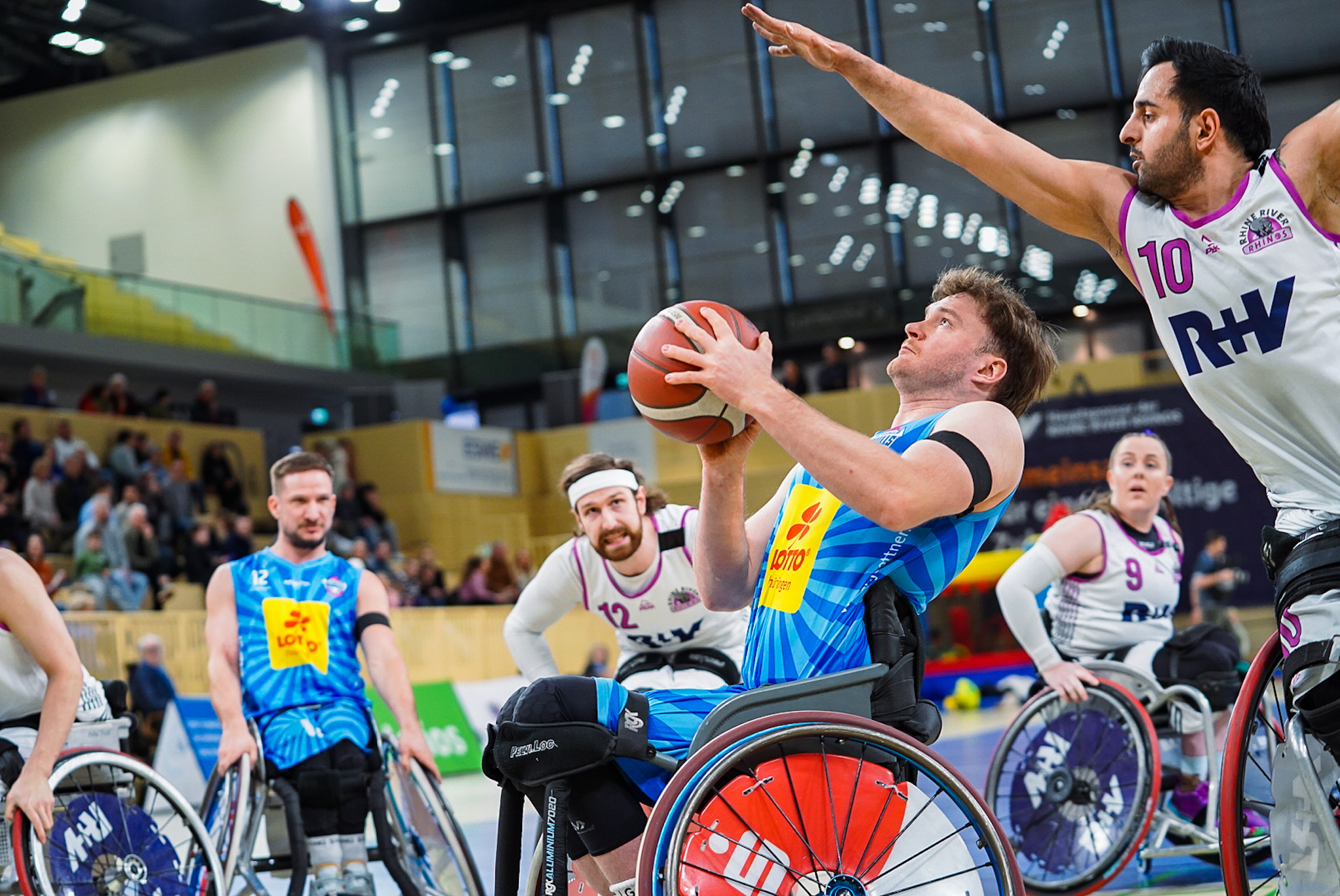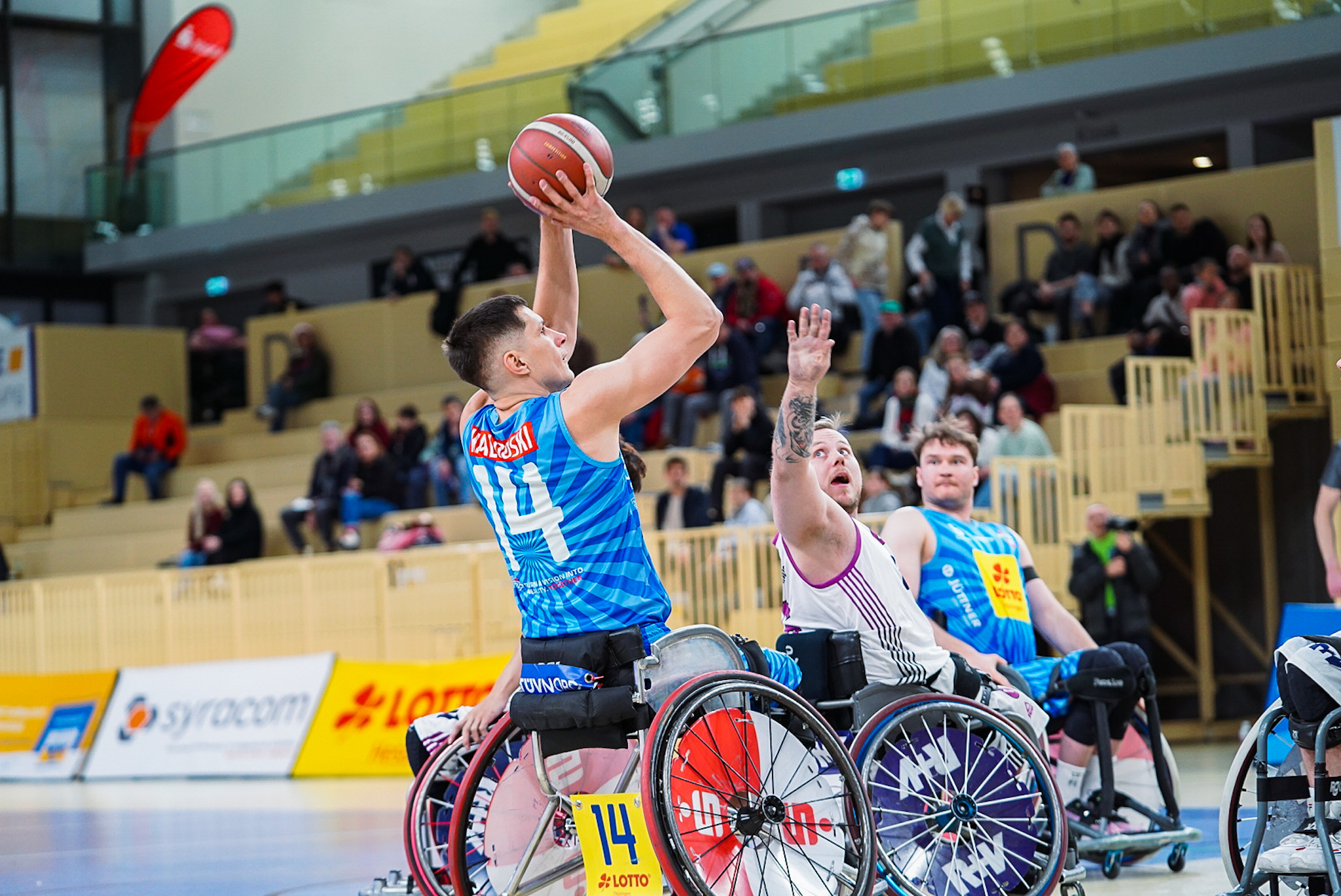 Der Start in den zweiten Abschnitt gehörte den Hausherren. Nach einem Buzzer von Dreimüller und einem Korbleger von Neuzugang Furusawa erspielten sie sich eine 18:13-Führung (13. Minute). Diese zwang Head Coach Bienek zur Auszeit, die Wirkung zeigte. Sein Team drehte die Partie und übernahm beim 19:18 (15. Minute) wieder die Führung. Es war kein Spiel für Feinschmecker, sondern für Liebhaber von robustem Rollstuhlbasketball. Die vielen zweiten Wurfchancen hielten die Rhinos im Spiel, die vor allem Mojtaba Kamali konsequent ausnutzte. Mit der Schlusssirene verkürzte er auf den Halbzeitstand von 25:23.