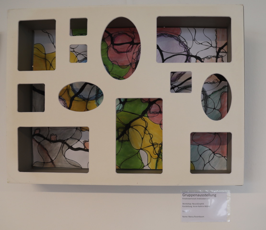 Rund ein halbes Jahr nahm zudem die Vorbereitung der anlässlich des Festes eröffneten Ausstellung in der historischen Kegelbahn in Andisleben in Anspruch. Hier hat die Kreativwerkstatt ihr Domizil und verfügt über eine eigene kleine Galerie. 85 künstlerische Arbeiten, die in der Werkstatt entstanden, wurden gezeigt. Die Kreativen haben Arbeiten ganz unterschiedlicher Genres vorgestellt: Klöppeln, Filzen, Bleichen, Upcycling, Neurographik Makramee, und verschiedene Drucktechniken brachten sehenswerte Werke hervor. Unsere Bilder zeigen einen kleinen Ausschnitt. Jeden Freitag von 15 bis 17 Uhr können alle Interessierten sich die Ausstellung anschauen, noch bis zum 26. September.