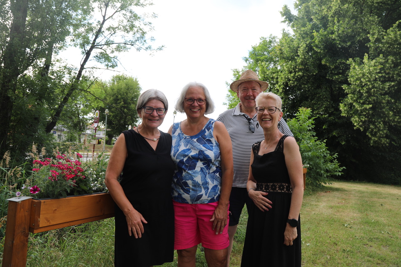 Anne-Kathrin Müller, Elisabeth Hemker (beide Kreativwerkstatt), Bürgermeister Hans Vollrath und Vereinsvorsitzende der Kreativwerkstatt Kathrin Kluger (v.l.) auf der neuen Event-Fläche neben der alten Kegelbahn