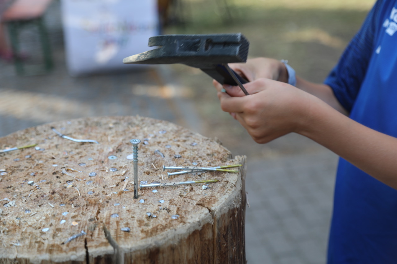 Geschicklichkeit ist Trumpf: Wer bekommt den Nagel gerade ins Holz?