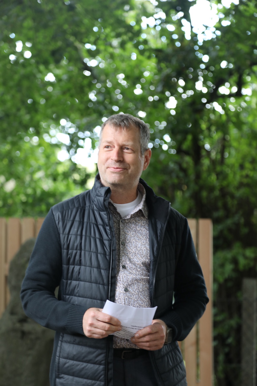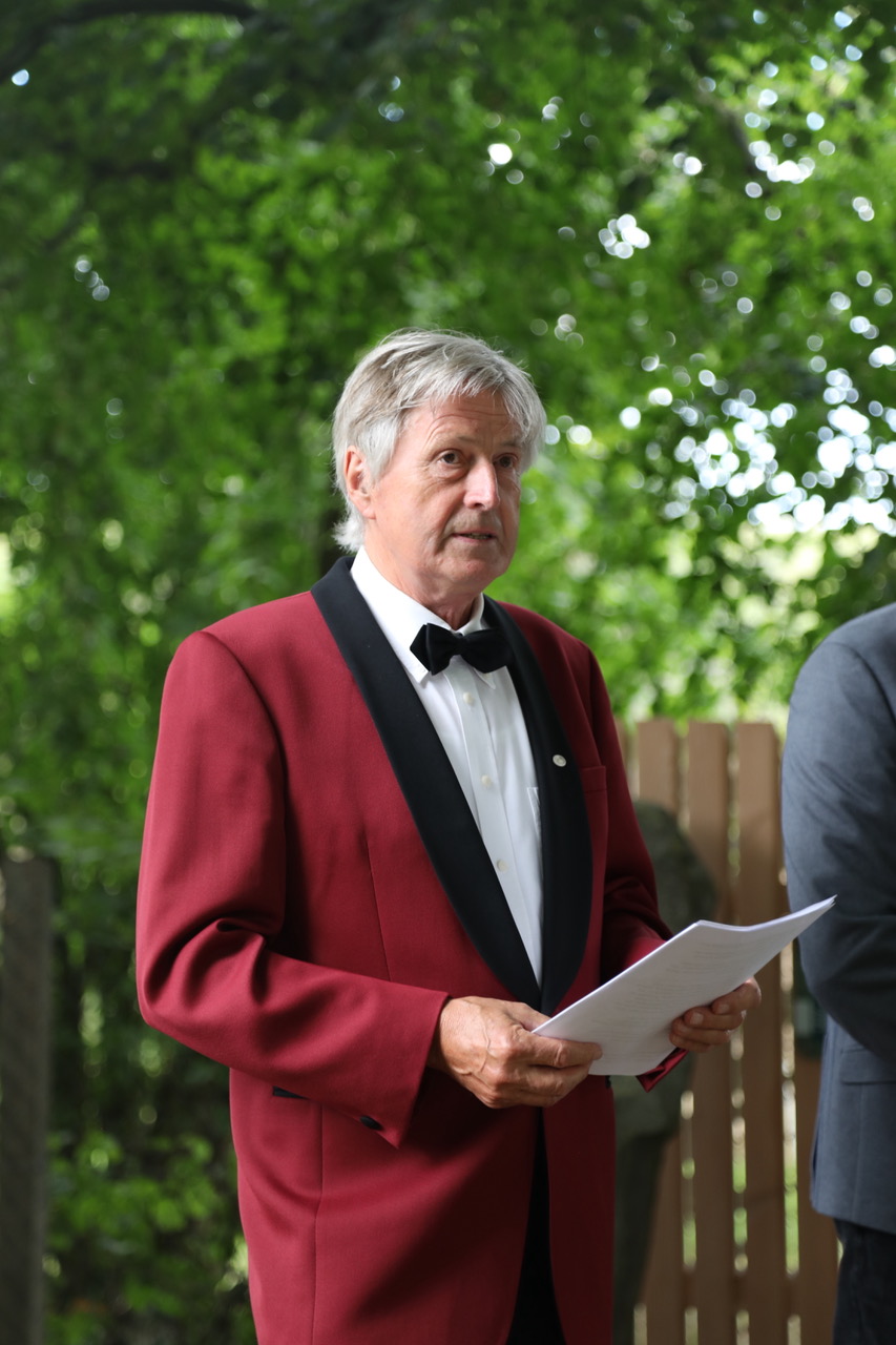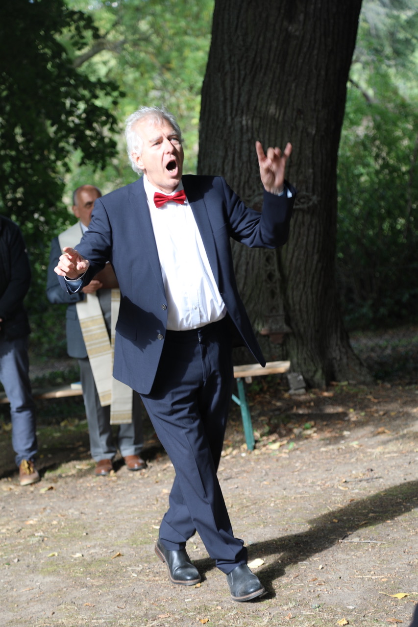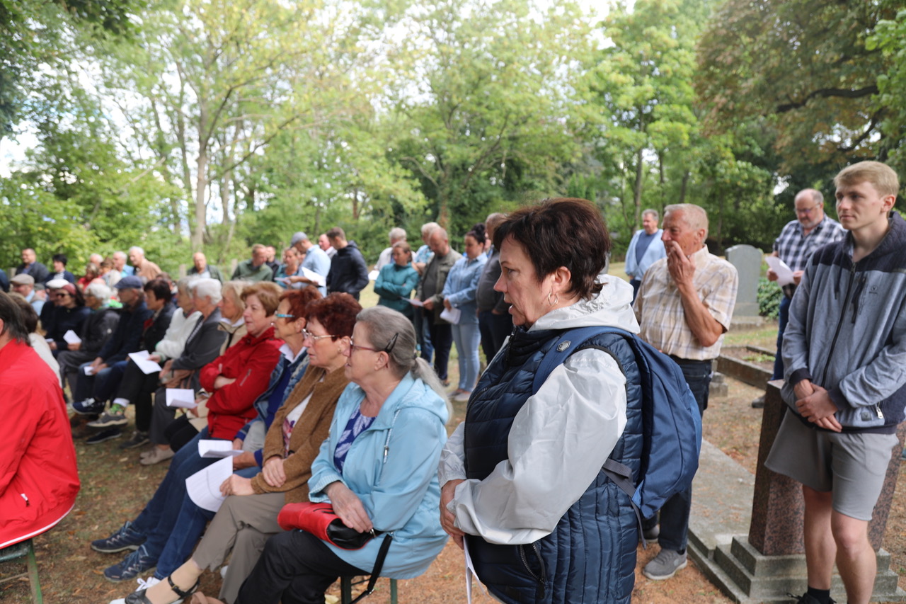 „Traditionen sind wie Laternenpfähle. Sie leuchten in der Dunkelheit, um Menschen den richtigen und sicheren Weg zu weisen. Nur Besoffene hängen sich daran auf.“, zitierte Pfarrer Johannes Preiß in seiner Ansprache eine Spruchkarte. Und tatsächlich sind Leute hier auf dem Friedhof von Friedrichsdorf zusammengekommen, nicht, um den alten Stein mit formelhaften Sprüchen, geheimen Ritualen oder schamanenhaften Tänzen zu ehren, sondern sich von diesem alten Stein wie von einer Laterne führen zu lassen, um den rechten Weg zu gehen“, führte er weiter aus: Dieser unscheinbare, schief stehende Stein war für die Menschen in vergangener Zeit von großer Bedeutung. Auch kündet er vom gelebten Glauben unserer Vorfahren. Wieviel Stürme, Kriege und Verwüstung hat dieser Stein wohl gesehen?“