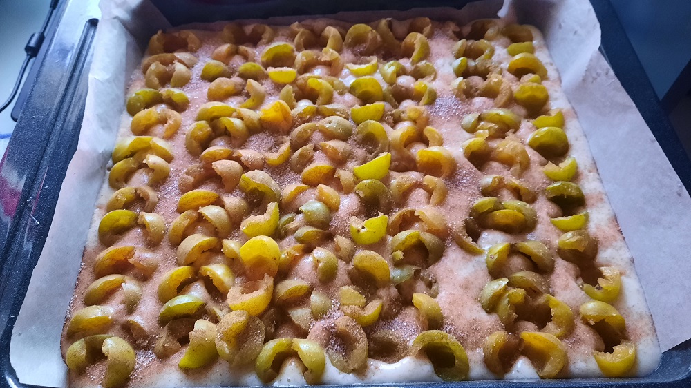 Teig: 4 Eier, 150g Zucker, 2Vanillezucker, 100g Öl, 100g Wasser, 1 Essl. Zitronenkonzentrat (oder Saft und geriebene Schale ½ Zitrone), 300g Mehl, ½ Backpulver,