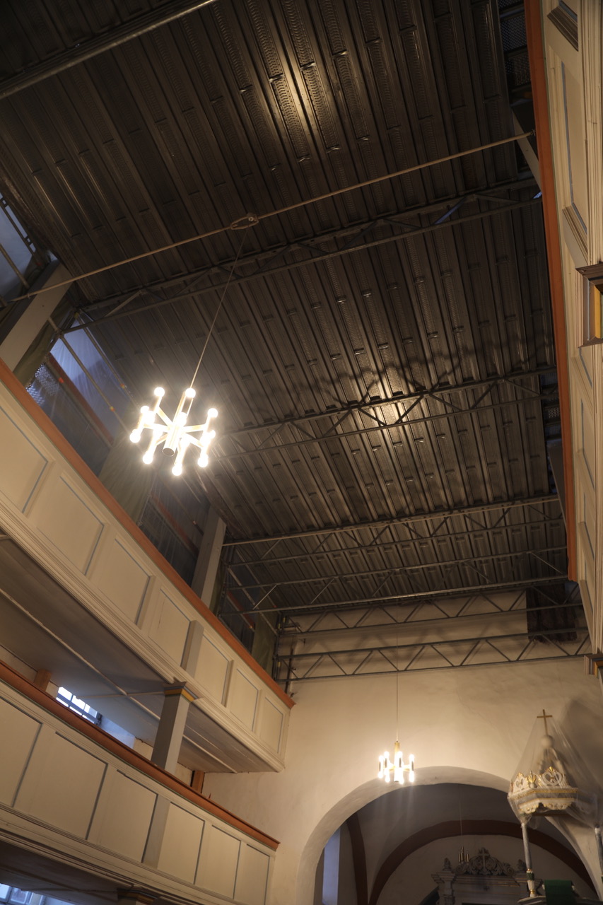 Die reich mit Ornamenten verzierte Decke wurde einst mittels zweier Verfahren hergestellt: Der sog. Antragsstuck wurde vor Ort „gezogen“, d.h. seine Herstellung war Teil des Schaffens am Inneren des Kirchendachs. Andere Ornamente, wie z.B. kleine Blüten, waren in Werkstätten vorgefertigt und dann an der Decke befestigt worden. Die Befestigungselemente sind z.T. verrostet, müssen angeschliffen und behandelt werden.