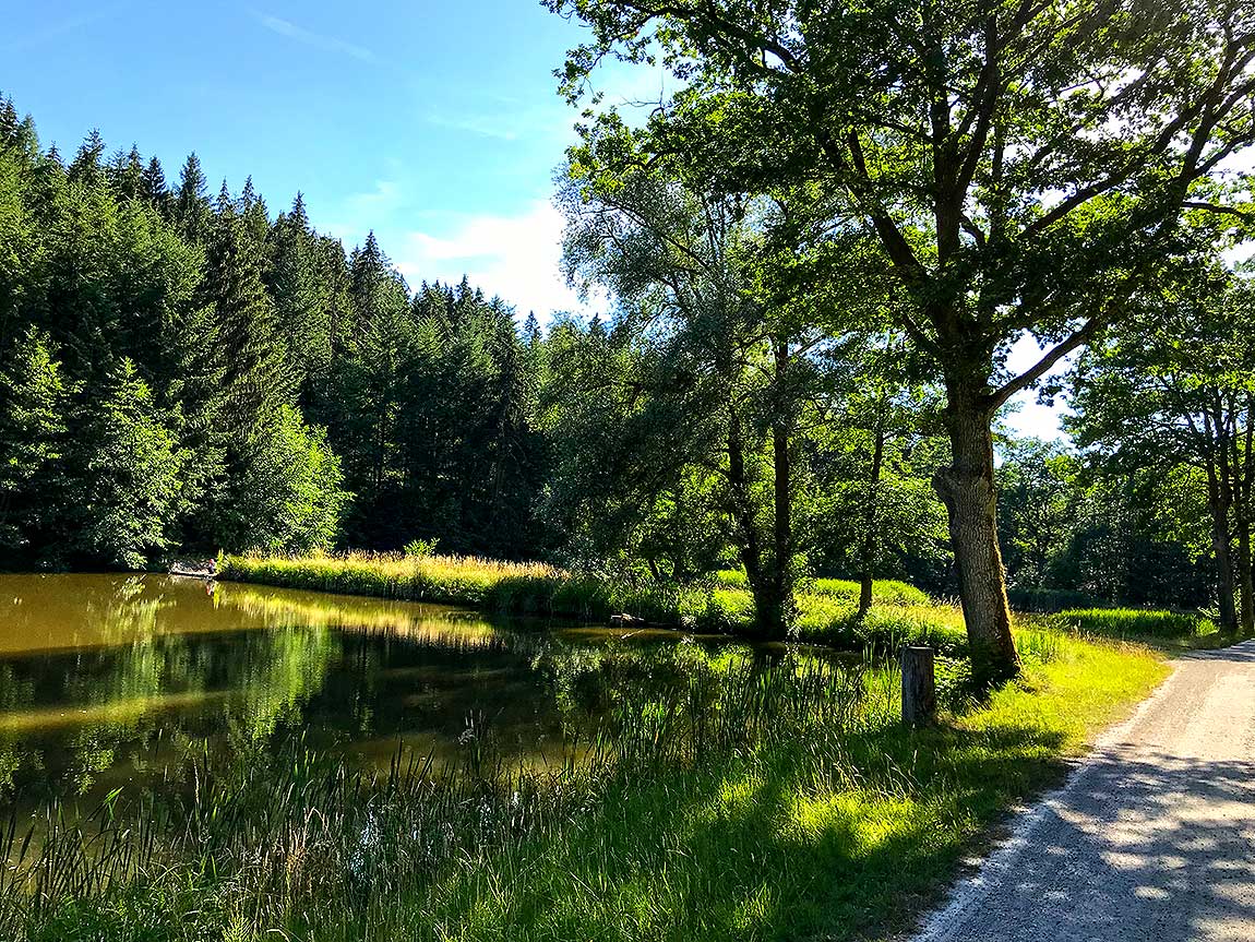 Aus diesen Gründen zieht es uns in die Natur in Richtung schöner Teiche und eines Kneipp-Areals. Im die Hitze mildernden Baumbestand lässt es sich hier gut wandern oder nur wandeln, ganz nach eigenem Gusto. Wir gehen zunächst ein Stück auf dem Goethe-Erlebnisweg.