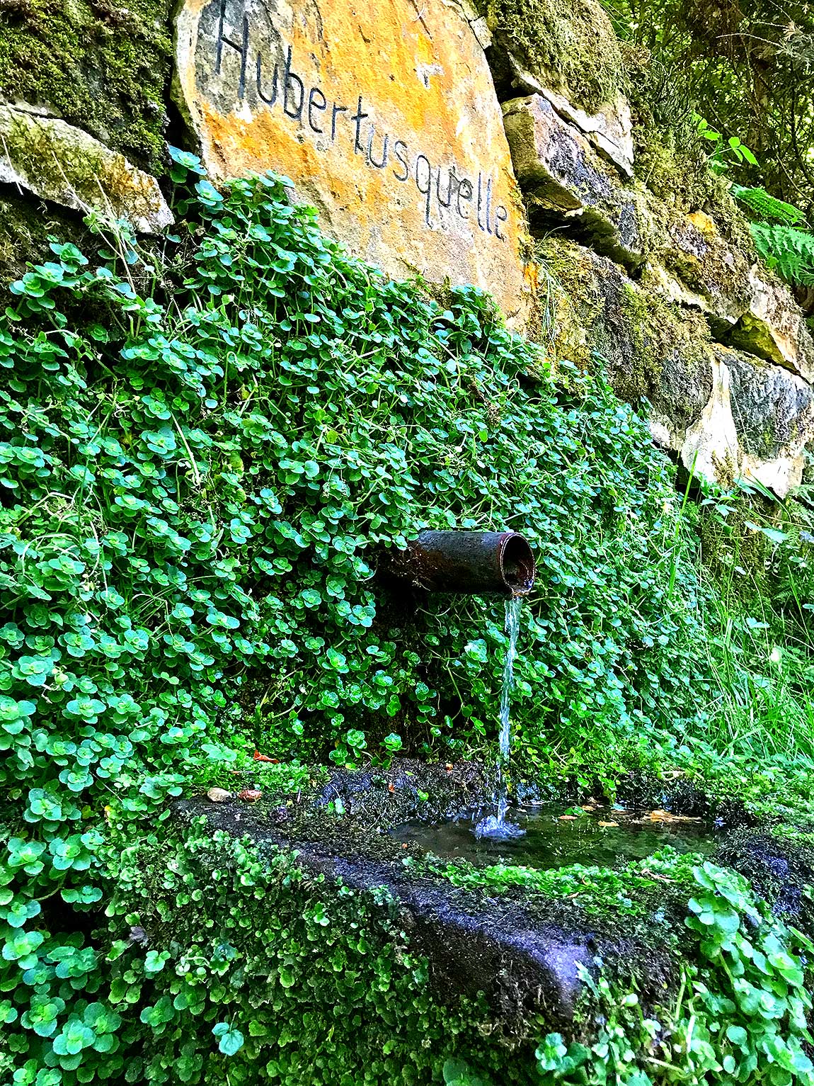 Einige hundert Meter weiter erreichen wir die Hubertusquelle, deren Wasser so rein ist, dass man es trinken kann. Hier füllen sich die Wanderer ihre Flaschen oder auch die Bewohner Bad Berkas.